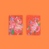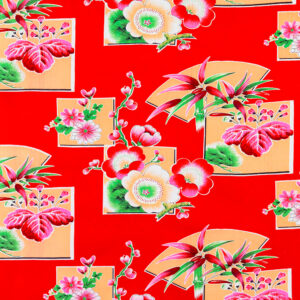 大紅底扇形圖案作背景將各季節的植物花樣框進畫面,扇形紋樣在傳統裡象徵著風雅韻事;而梧桐花、菊與櫻、松與竹都是日本人愛用的各季花樣,再鋪上喜氣大紅色就顯得台味十足,變成道地的、台灣的、阿嬤的大紅花布。
