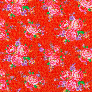滿地花描的橘黃色小花藤紋與上層大、中、小三叢牡丹花叢的連續三小構圖,牡丹四季花內容已被簡化,化約成一種台灣花布的基本款單位;現在市面上的台灣花布幾乎都是屬於這一種類型牡丹花叢的延伸或放大縮小⋯⋯Specification|產品規格